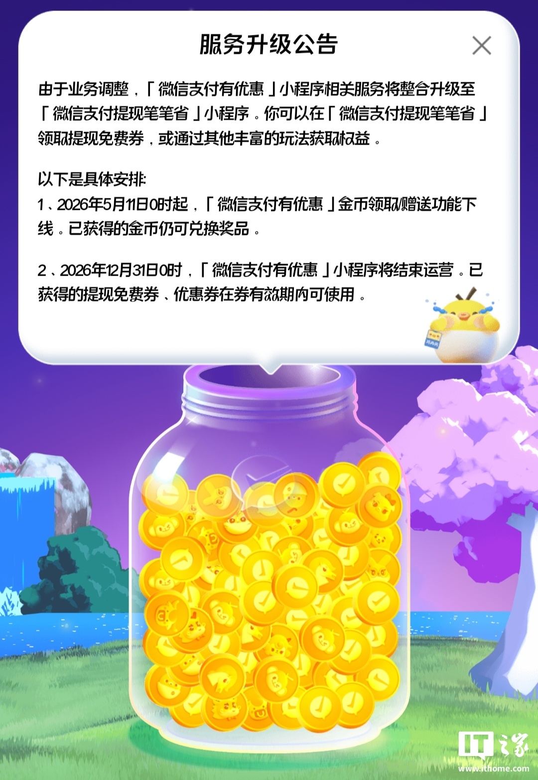 微信宣布「微信支付有优惠」小程序将于 2026 年 12 月 31 日结束运营,相关服务将整合升级至「微信支付提现笔笔省」小程序。5 月 1 日起金币领赠功能下线,但已获得的金币仍可兑换奖品,已领取的提现免费券在有效期内仍可使用。